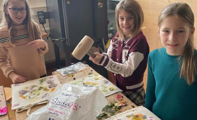 Beim IBF-Kurs „Hammered Flowers“ konnten sich die Kinder kreativ entfalten. Mit einem Hammer wurden Abdrücke von Blüten und Blättern auf Baumwolltaschen gemacht. ![]()