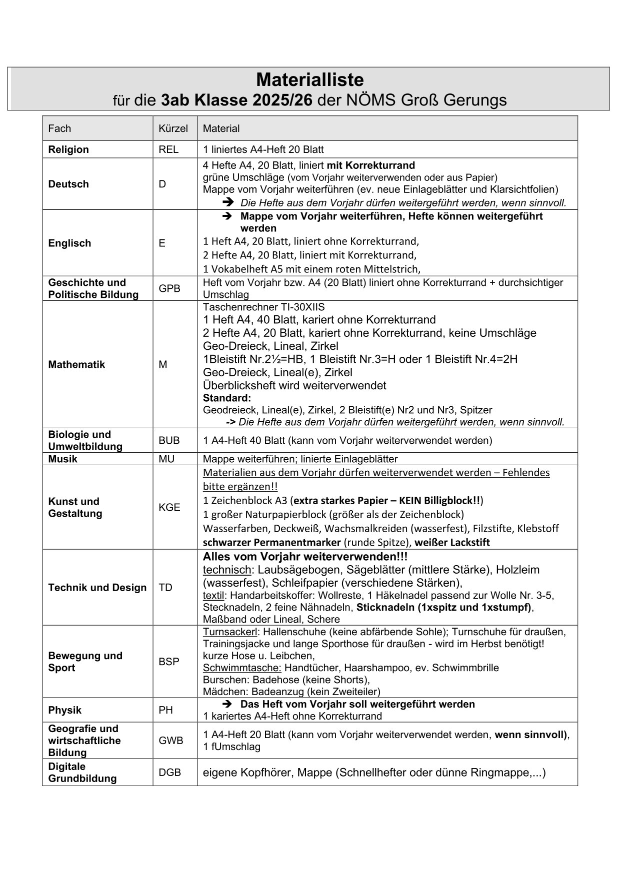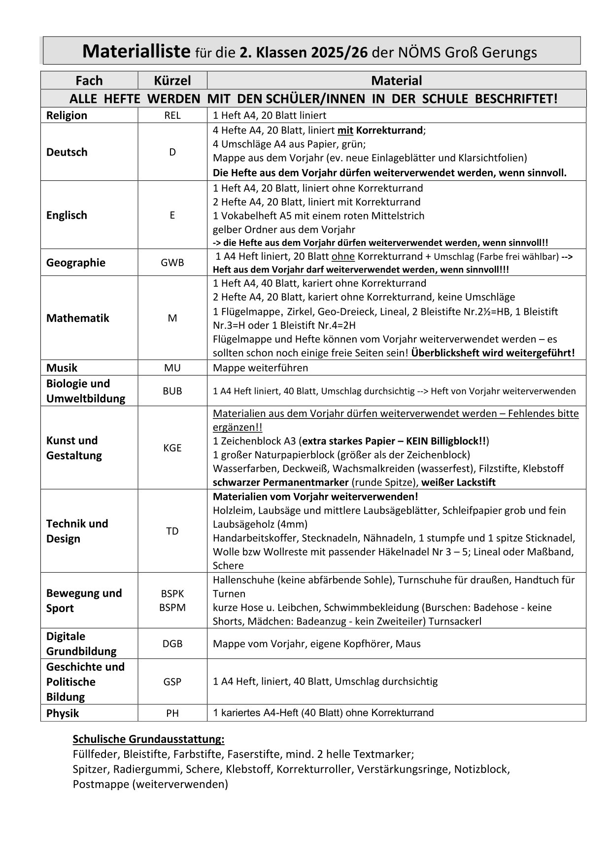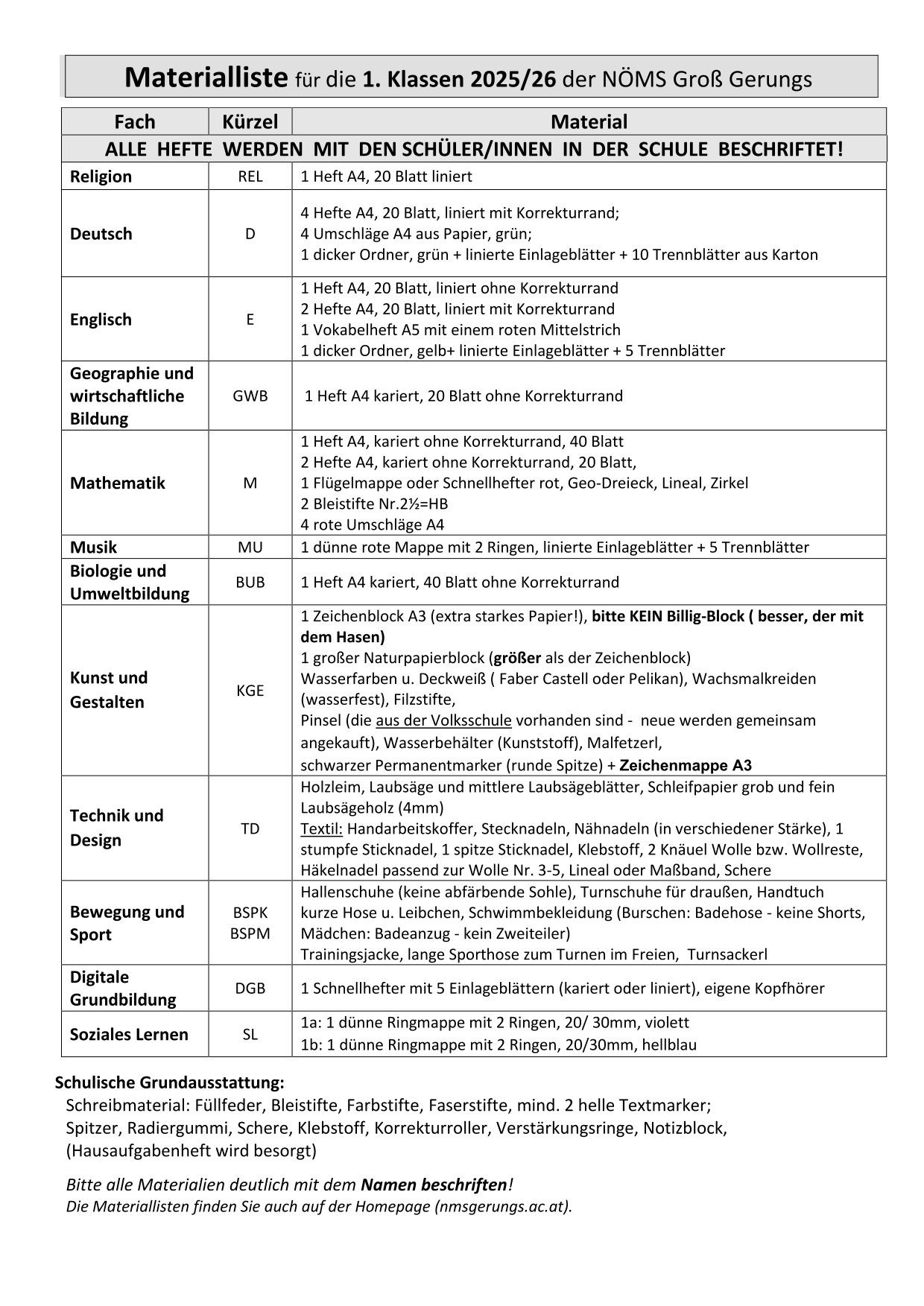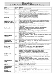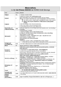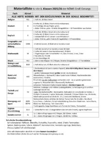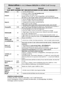 Materiallisten für das Schuljahr 2025/26