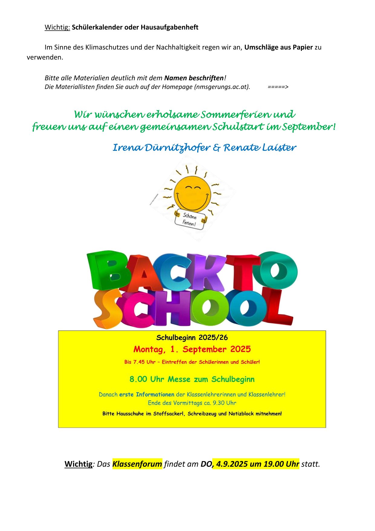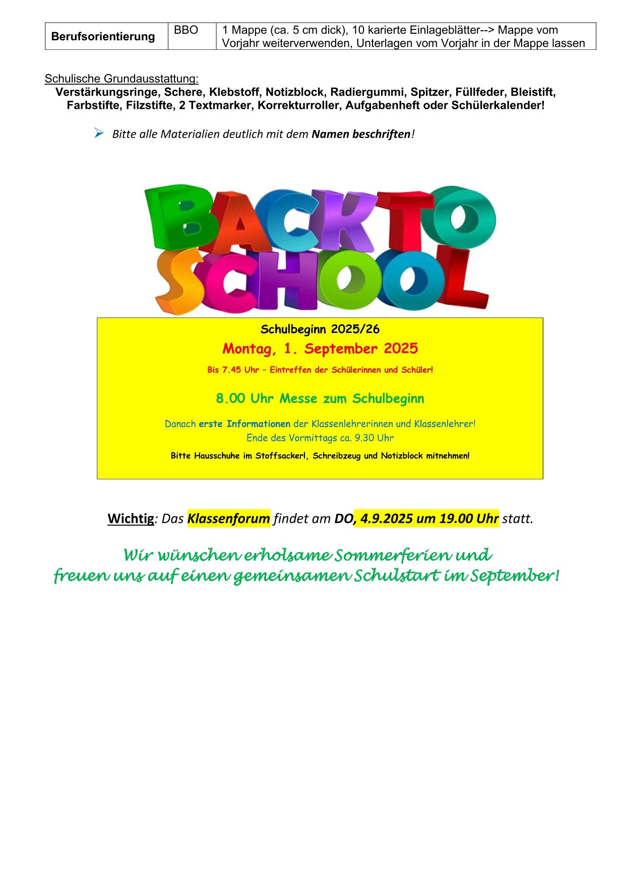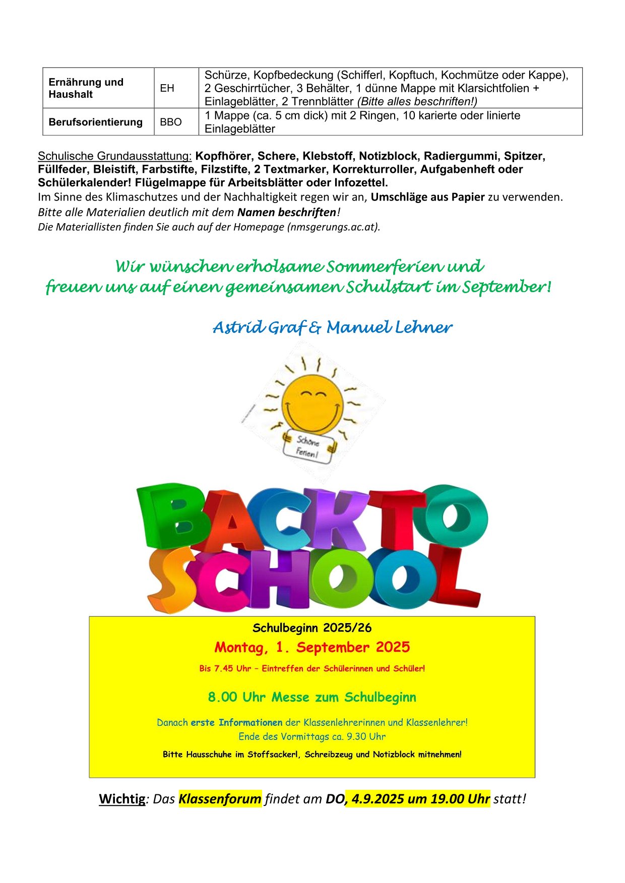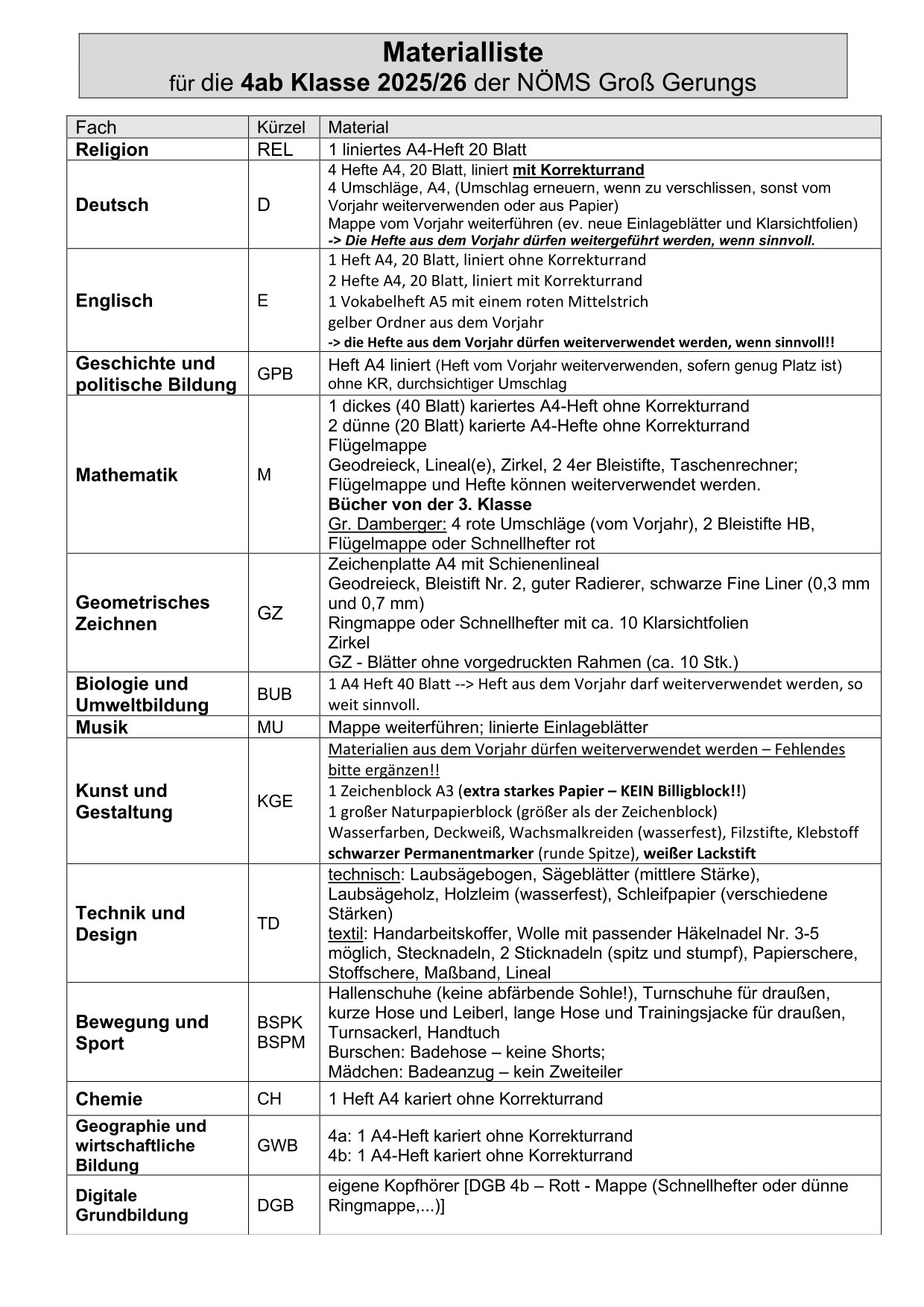 Materiallisten für das Schuljahr 2025/26